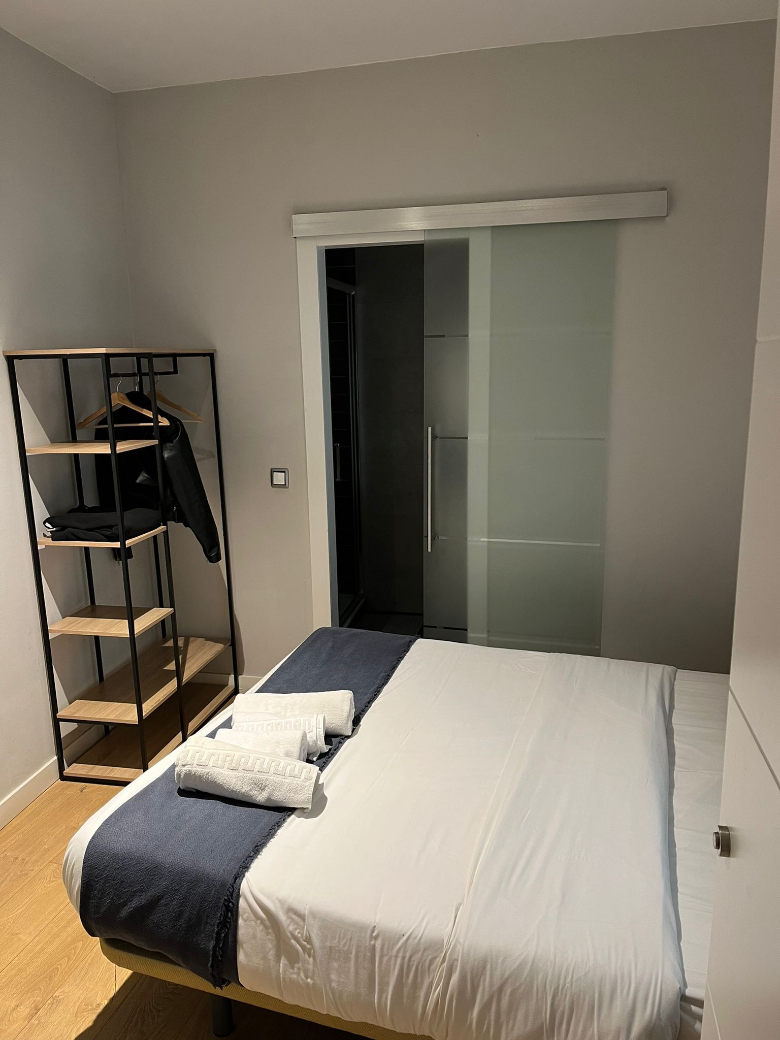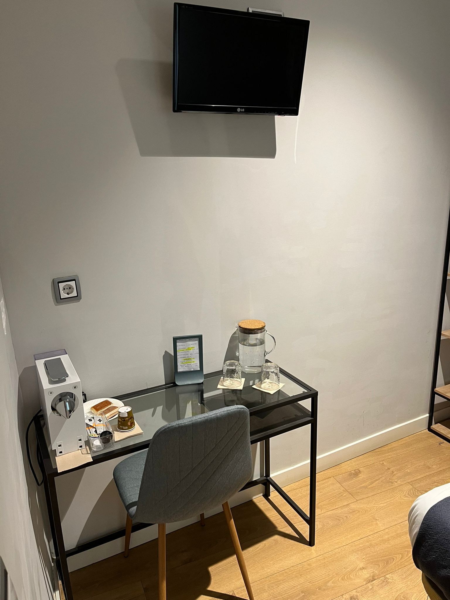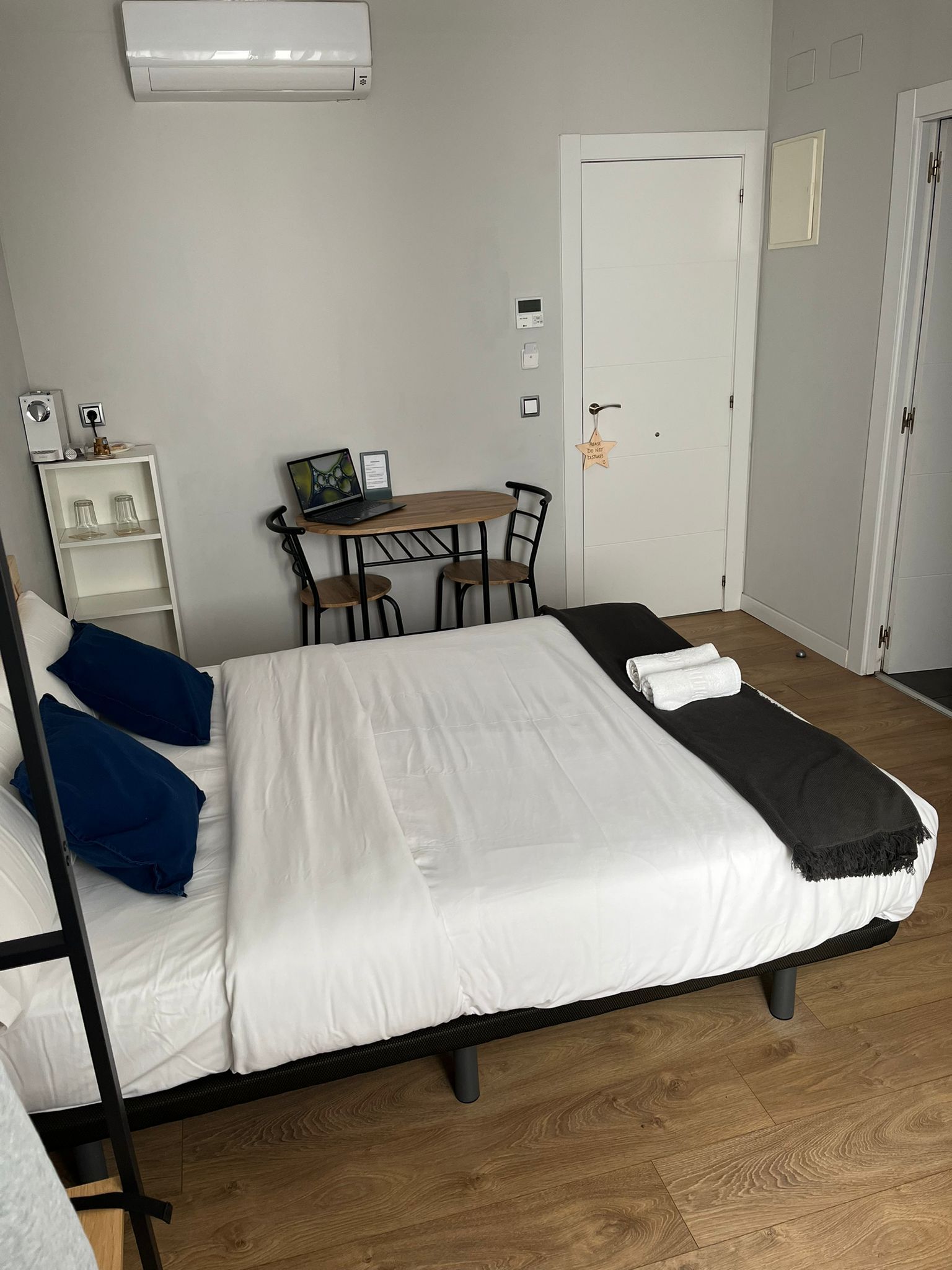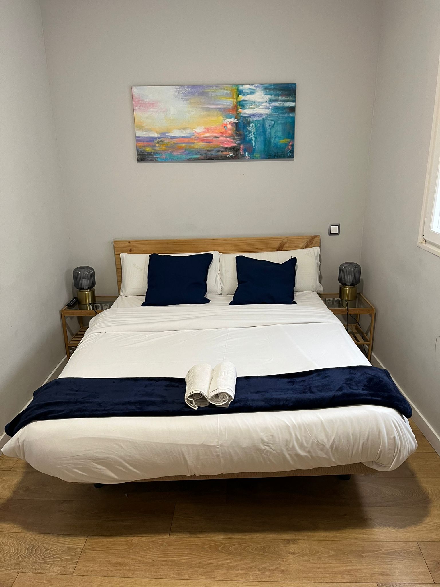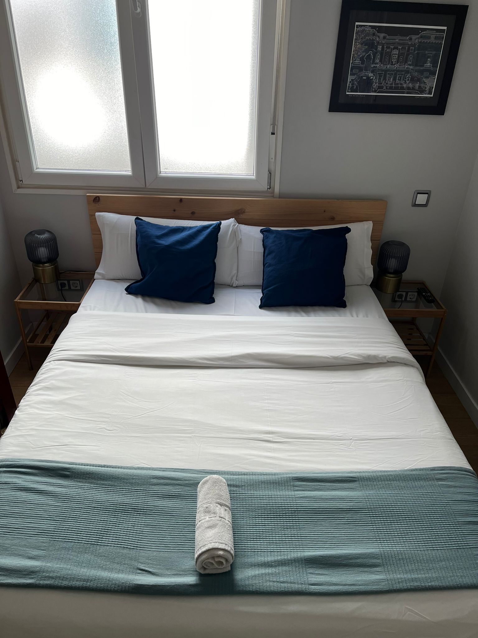 Habitación doble interior con cama de matrimonio (1,50 x 1,90 m), acogedora y tranquila, ideal para descansar en pleno centro de Madrid. Dispone de televisión,servicio de limpieza diario, wifi gratuito y cafetera con cápsulas. Estilo boutique, cómoda y funcional.